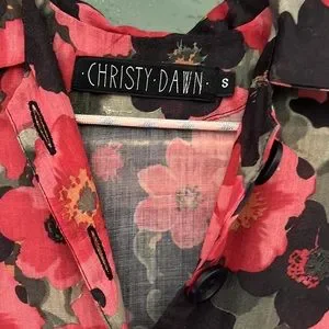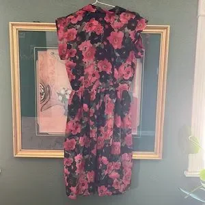 Elegant black dress with vibrant pink floral pattern. V-neckline and short sleeves. Perfect for any occasion.