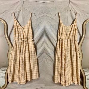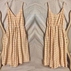 Yellow and white plaid jumpsuit romper with thin spaghetti straps, crossing front, adjustable waist-drawn ties, and pockets!