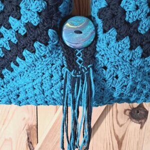 HP 8/3/25 6/30/24 9/26/24 Three teal 70% cotton 30% polyester and black 100% cotton yarn granny squares are connected to become a cute hand held, shoulder or crossbody bag. Closure is a crochet strap with a button hole for a 2" hand painted wooden resin button to close it. The strap finishes with some fringe in teal and black and 3 X's. This purse is lined with black rayon fabric.