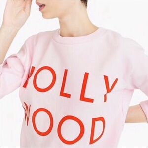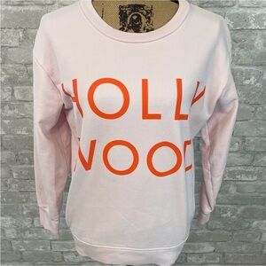 So cute! Light pink sweatshirt with bold red 'HOLLYWOOD' print. Comfortable and stylish.