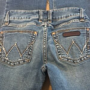 Stylish boot cut jeans by Wrangler. Features classic blue denim. Ideal for casual wear.