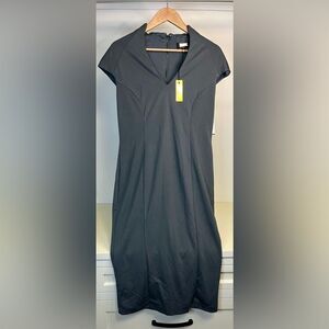 Stand-up collar V-neckline Cap sleeves Exposed back zip closure Princess seams Contrast lining Center back vent Tonal topstitching Panel seaming Fully lined Stretch Ponte