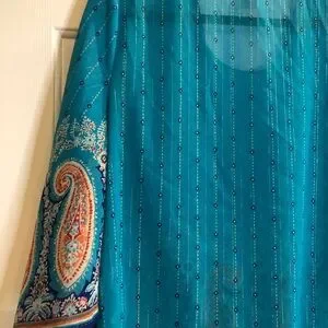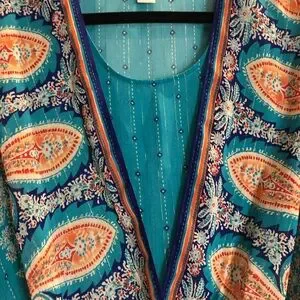 Elegant teal top with navy patterns. Lightweight and stylish. Boho