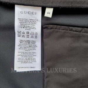 Unique Features: These impeccably tailored Gucci trousers are crafted from a luxurious blend of silk and wool, offering both structure and fluid drape. The sleek silhouette features a high waist, sharp front creases, and a straight leg cut for a timeless, elongated look. Finished with a striking gold-tone Interlocking G logo button at the waistband, this pair subtly nods to the brand’s heritage while exuding understated elegance. Zip and button fastening. Goldtone signature GG logo button. Two slip pockets on the front. Two button pockets at the back.