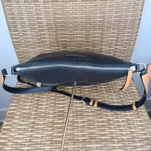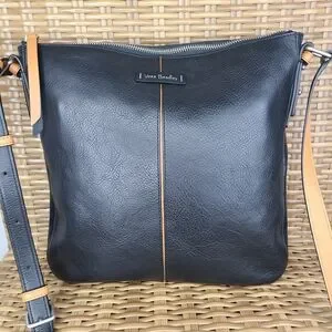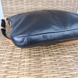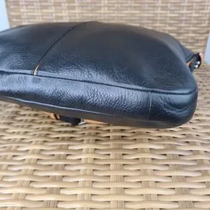 Vera Bradley Gallatin black leather crossbody bag. Classic leather Crossbody with tan leather and brushed metal accents. Large zipper pocket on back, with two slip pockets and a large zip pocket inside. Adjustable shoulder strap. Gallatin Leather has a very smooth hand, and will patina with age.