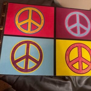 Add a pop of color and retro flair to your space with this vibrant storage box! Featuring bold peace sign graphics in a Warhol-inspired grid, this chest is both functional and fun. Perfect for storing keepsakes, crafts, or accessories. Sturdy construction with a secure latch closure and vintage-style rivets.