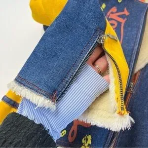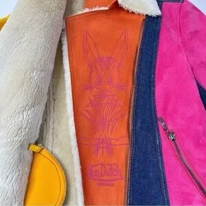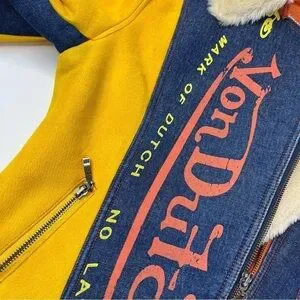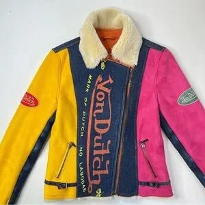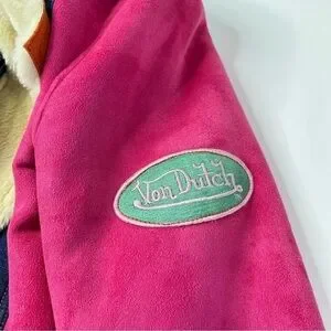 RARE Vintage Von Dutch Y2K Pink & Yellow Suede Blue Denim Faux Fur Bomber Jacket
