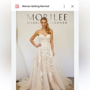 Chic strapless gown adorned with white floral appliqué on a tan background. Ideal for special events.