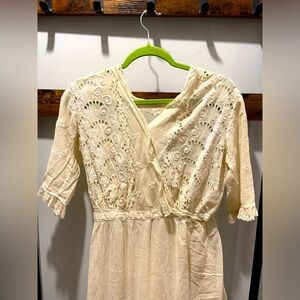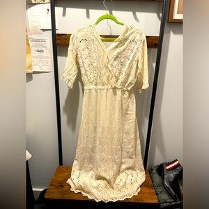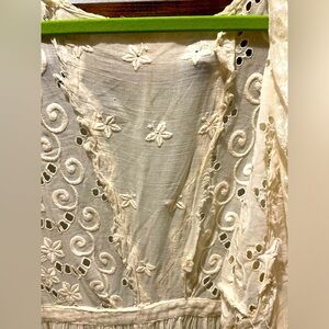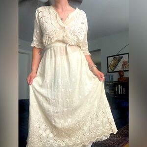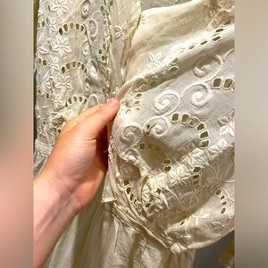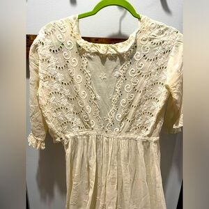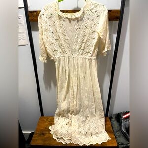 Step into a new world in this beautiful antique garment from the early 1870s. Perfectly preserved. Floral lace eyelet prairie dress. Cotton, very light and breathable. The only imperfection is one stain pictured. There are no holes or damage otherwise. The dress has a unique clasp system specific to the time period. The dress is ankle length at about 28inches with a waist around 25inches. If you are handy you can move the buttons around and reclasp. Beautiful piece - if only we could hear its stories!
