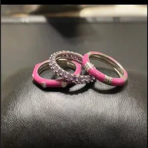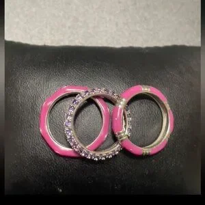 Super cute stackable rings, versatile design and a fun fashion statement. Size 7 …. 2 dark pink enamel designs with clear zircon and matching pave eternity zircon ring. Perfect!!