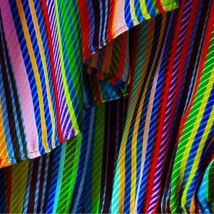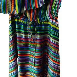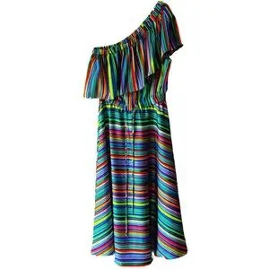 Vibrant one-shoulder dress with playful stripes. Perfect for casual outings.