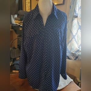 Elegant navy shirt featuring white dot pattern. Ideal for versatile wear. Crazy morning, so easy to dress with cream or black bottoms. Easy to pack and look amazing.