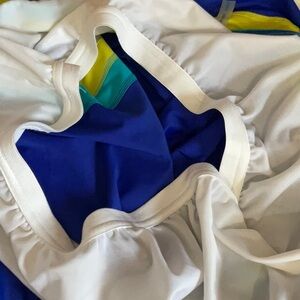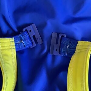 Stylish one-piece with bold blue and yellow design. Ideal for swimming and sunbathing. Measurements: length 34 inches long , bust 22 inches wide, armpit 30 inches round, opening leg 26 inches round, built in bra, barely worn, stretch. Please check the photos and the size. Color may vary due to the effect of light in taking pictures