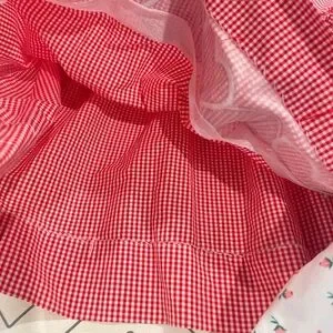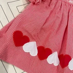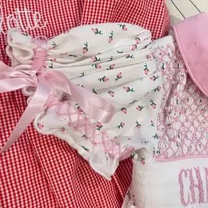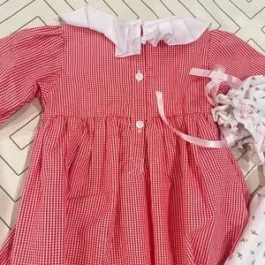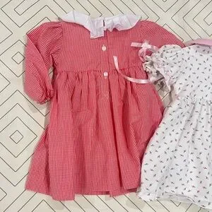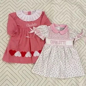 Both size 18mo. Red and white checkered with white cursive Charlotte embroidered at chest and heart appliqués at bottom. White with floral and smocked chest with pink Charlotte embroidery. Both in excellent condition. Selling as a set.