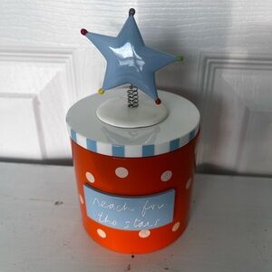 Pale blue, orange, and white children’s keepsake. Features “Reach for the Stars” engraved on the front, polka dots, and detachable lid with springy star on top. Perfect for jewelry, accessories, or special mementos!