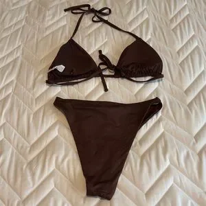 Enjoy the sun in this classic brown bikini set. Perfect for a stylish beach day. Toluca swim brand size medium/large top and medium bottom
