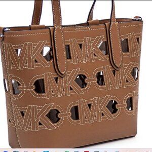 Revamped for the summer season, Michael Kors updates the Eliza tote bag with a cut-out construction for an effortless summer vibe. This versatile piece is made with smooth synthetic leather and features the all-over MK logo on the exterior, double leather handles, a transparent lining, magnetic closure, and a spacious design perfect for your weekend and vacation wardrobe.