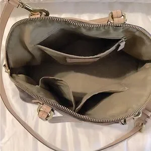 Elegant Coach shoulder bag. Features brown body with tan straps. Gold hardware accents.