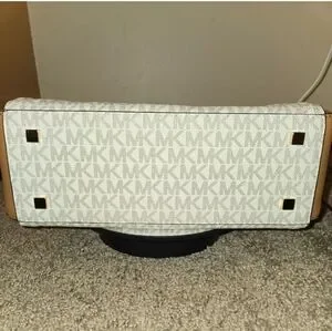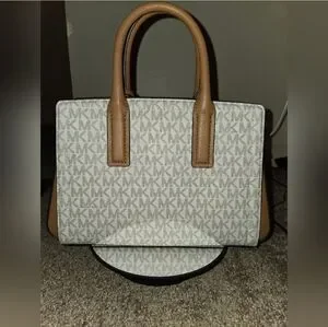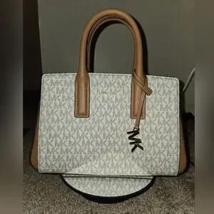 Elevate your style with the Michael Kors satchel bag. Featuring a chic cream and tan design, this bag is perfect for any occasion. Crafted with attention to detail, it offers both elegance and functionality.