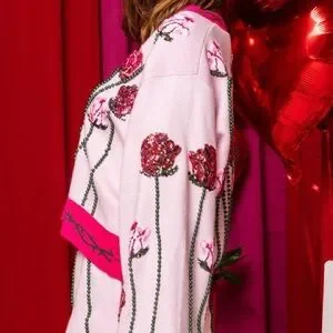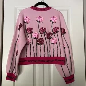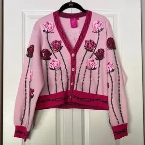 Charming pink cardigan with rose embellishments. Features sequin details and button closure. Perfect for adding sparkle.