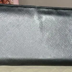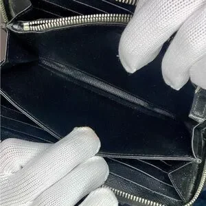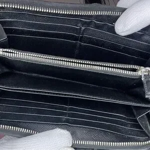 Black Prada Long Wallet using Saffiano Leather EUC, features a zip around closure, to secure all your belongings. The interior features 8 card slots on each side, long compartment for bills, and a coin pouch that opens up to two more compartments. COA included
