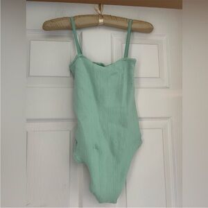 Hunza G Maria Swimsuit in Pistachio 88% nylon 12% lycra elastan. Made in England. Hand wash. Unlined. Stretch fit.