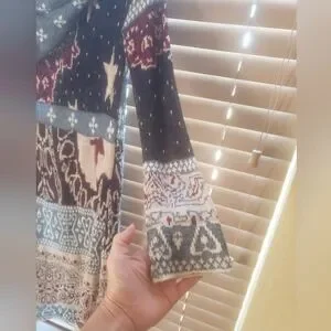 Cozy hooded knit Boho Knit Duster in a multicolor pattern. Features shades of blue, red, and cream.
