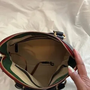 I used this for about two weeks after I got it so it's still in the same condition as the photos. Love it, but I have other colors in this style that I reach for more. It has been carefully stored in a dust bag in my closet. Beautiful Dooney bag and ready for a new home!