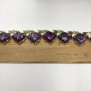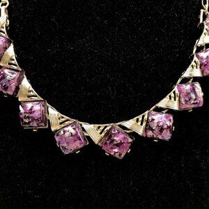 This VTG 80s CORO Purple Glitter Stone Silver Necklace features a stunning square purple resin stone pendants with a hook closure for easy wear.