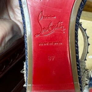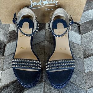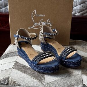 Manufacturer details: The Madmonica 60 wedge is an elegant sandal with gleaming studs that add unexpected dimension. A luxurious cotton denim fabric is paired with gleaming rope detail. Cotton denim and ropes of jute invite carefree, sunny days in a sandal set on a low wedge and chunky platform with gleaming studs adding unexpected dimension. Christian Louboutin's glossy red sole puts a pop of familiar color under every step. Textile upper Round, open toe Adjustable ankle strap with buckle closure Spike details across vamp Rope midsole Leather lining and insole Leather sole Made in Spain . Approx Heel: 2"