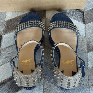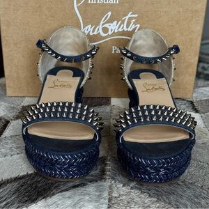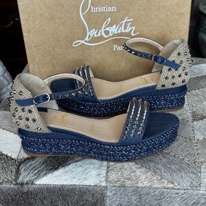 Gorgeous Authentic Christian Louboutin Mad Monica spiked denim sandal. Denim Blue with silver tone stud detail. Preowned by me and worn only a couple of times, in pristine condition. I absolutely love them but parting with a few of my shoes. Includes original box and dust bags as shown. Sandals have the new red rubber bottoms that Louboutin now uses on his platform shoes so they will continue to stay red and beautiful! Please know your Louboutin size. All photos are of these shoes. I purchased them from Neiman Marcus in Atlanta. Please note platform beauties are a little heavy,