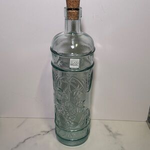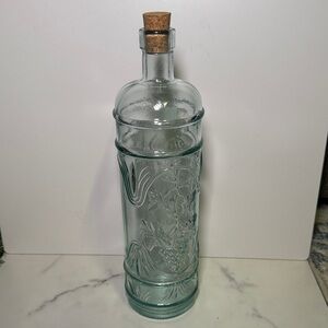 Elegant clear glass bottle by San Miguel, featuring intricate embossed designs and a natural cork stopper. Perfect for adding a touch of sophistication to your kitchen or dining area.