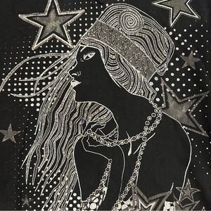 Vintage early 2000s fitted black tee by Pop Up USA featuring a stunning silver star goddess design with metallic embroidery and rhinestone accents. Stretchy cotton-blend fabric, deep V-neckline, and serious Y2K vibes.