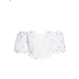 Romantic Rainey bustier crop top in ivory embroidered cotton with puff sleeves, lace-up front, and boned corset-style bodice. Eyelet details, scalloped trim, and lined interior add polish and structure.