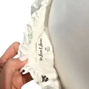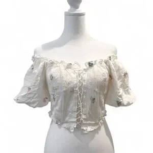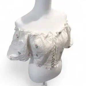 FOR LOVE & LEMONS Rainey Crop Top IVORY XS Eyelet Puff Sleeve Lace-Up