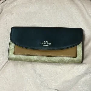 Stylish Coach wallet with a black, tan, and cream color scheme. Ideal for keeping essentials organized.
