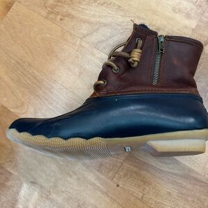 Stylish and durable women’s duck boots in blue and brown. Perfect for outdoor adventures.
