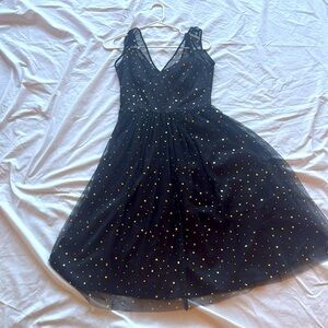This elegant black dress features a stunning moon and star pattern, perfect for any special occasion. The sleeveless design and flattering fit make it a must-have addition to your wardrobe.Full skirt with mesh overlay, sweetheart neckline and retro style. ModCloth Hell Bunny size XS. Excellent used condition.