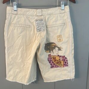 Women's Da Nang Japanese Embroidery Tan Bermuda Shorts size small, Inner button with zipper & hook closure, 100% cotton, machine wash cold, waist measures 15", crotch rise 8.5", Outer seam length waist to hem 19", Inseam 10.5", Good condition 🎏
