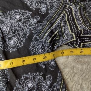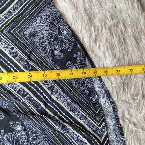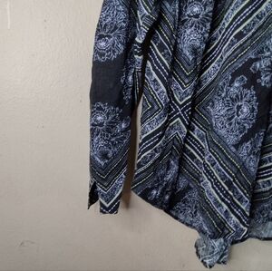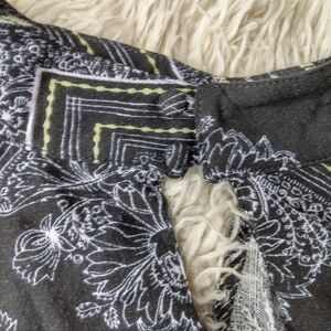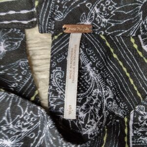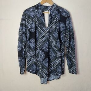 Flirty and boho chic Free People Walking on a Dream Tunic top! Gorgeous flowing black fabric with a geometric paisley and square stripe design throughout, with deep cutout accents at front and back neckline with button closure at back.