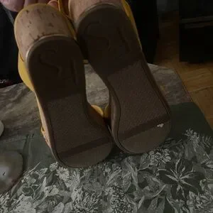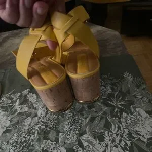 Bright yellow wedges with a colorful woven strap. Features adjustable ankle strap for comfort.