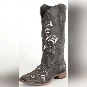 These fashionable EUC ladies' leather western boots have a 12" shaft with pull straps, piping, and metallic silver underlay design. They have a wide square toe, leather bottom, stockman heel, distressed finish, and padded insole for added comfort. Made of full-grain leather. Perfect boots for the modern cowgirl! Imported.
