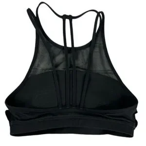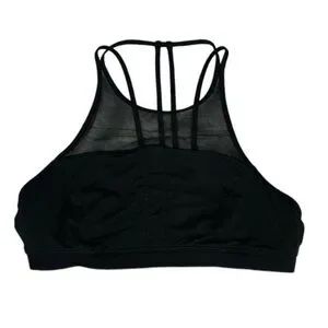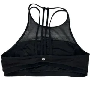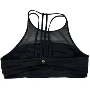 Experience unparalleled support and style with this black sports bra from lululemon athletica. Crafted from a stretchy, athletic fabric, it features a high neckline and a striking geometric strappy back design. Ideal for both workouts and casual wear, this piece combines functionality with a modern aesthetic.