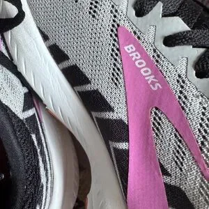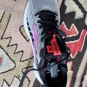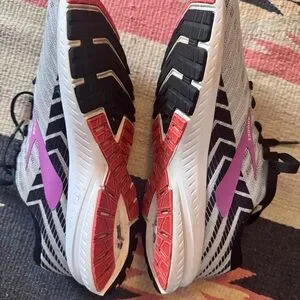 Brooks “LAUNCH 6” athletic shoes in gray with striking orange and purple highlights. Ideal for running. At point of purchase, I replaced the insole with my orthotic insole. I have now replaced original. No tears, shoes have been cleaned. I love the colors! The RW Takeaway: The Launch 6 is a neutral road shoe that’s lightweight yet amply cushioned for longer distance racing. An updated midsole with more foam in the forefoot. BioMoGo DNA provides a bouncy ride. A one-piece breathable seamless upper.