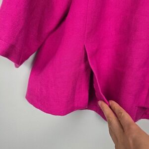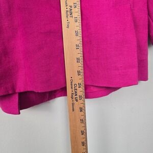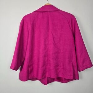 This Talbots Woman Petites blazer-style jacket is crafted in a vibrant hot pink linen blend, perfect for layering. Features a 3-button front, collared neckline, 3/4 sleeves, and dual front pockets with button flaps. Lightweight and fully lined — ideal for spring and summer office or casual wear.