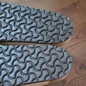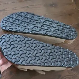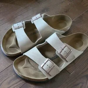 Classic Birkenstock mules in a soft beige. Features dual straps with buckles. Ideal for casual comfort.
