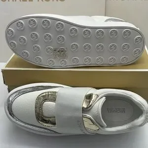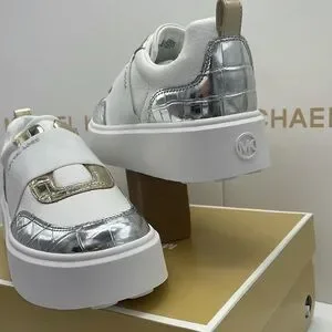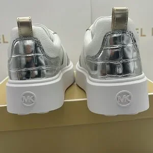 Elevate your look with these stylish Michael Kors sneakers. White leather with silver croc-embossed accents. Perfect for casual elegance.