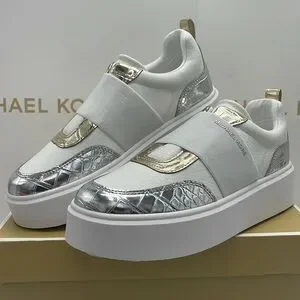 MICHAEL KORS Romey Mixed Media Slip-On Faux Tambled Platform Sneaker Silver New