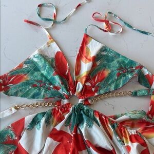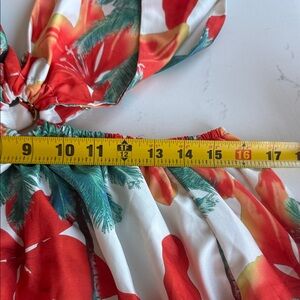 Step into elegance with this vibrant floral halter maxi dress. Featuring bold red and green hues, it's perfect for any sunny occasion.