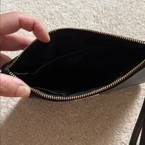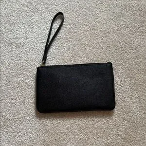 Sleek black wristlet with gold accents. Features a secure zip closure and wrist strap.